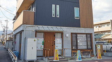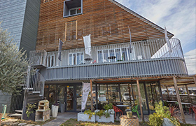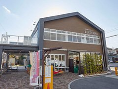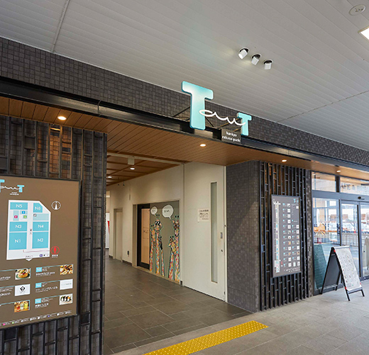 阪急「洛西口」駅から「桂」駅方面へとつづく高架下に、ゆったりとしたプロムナードのようなスペースを設けてショップを並べた「TauT阪急洛西口」。飲食店や各種サービス、オープンスペースなど表情多彩です。