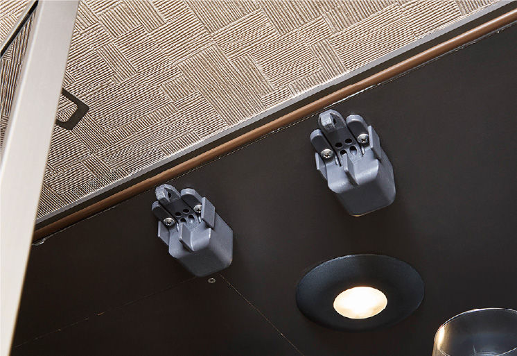 耐震ラッチ(参考写真) キッチンの吊戸棚には、大きな揺れを感知すると、扉をロックする「耐震ラッチ」を設置しています。食器類などの収納物の落下を未然に防ぎ、住まう方の安全を守ります。