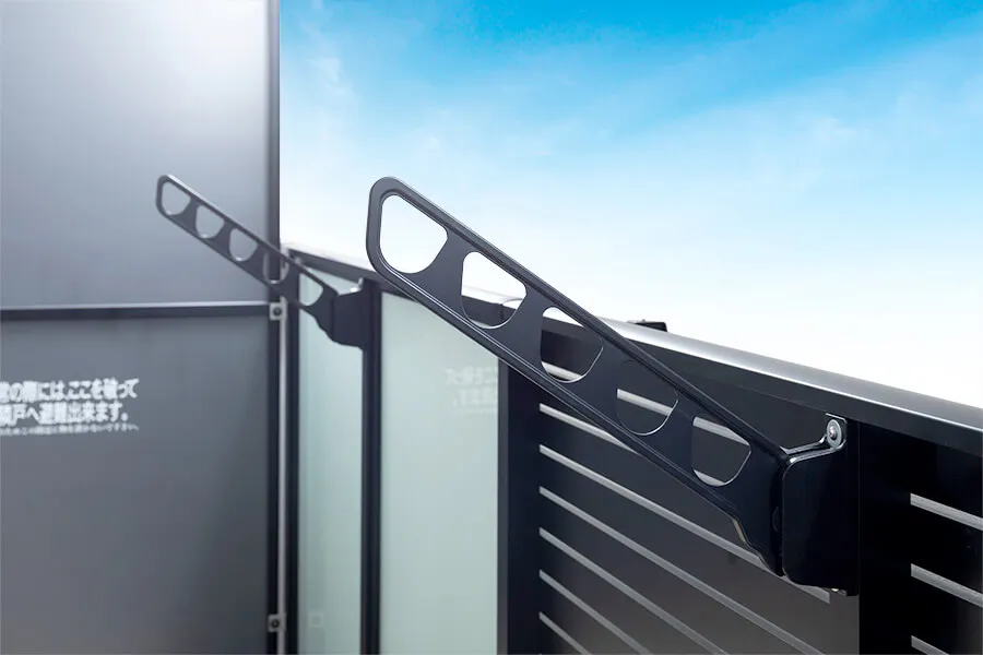 ベランダをスッキリと演出するため垂直収納式の物干金物を採用しました。