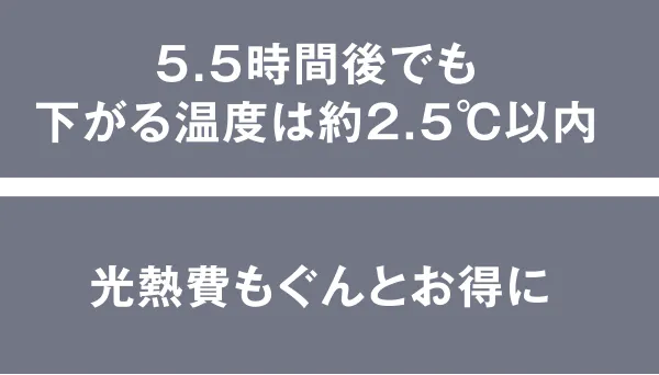 浴室内周囲温度:10℃/浴槽水量180L(浴槽底より400mmの高さ)/測定開始温度:42℃/5.5時間後湯温:かき混ぜた後の測定ポイントの平均値/浴槽サイズ:1100サイズ※状況により温度変化は異なる場合があります。 -