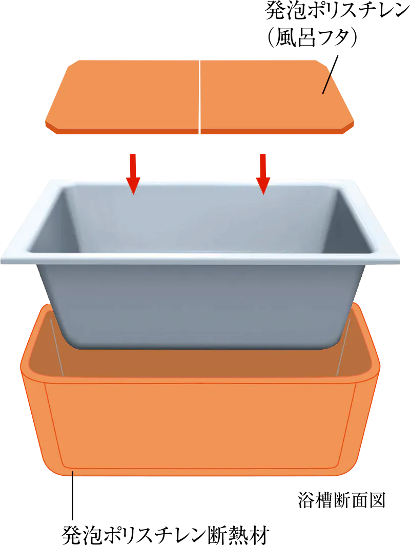 浴槽を発泡ポリスチレン断熱材でぐるっと断熱。追い焚き回数が減って光熱費も節約できます。