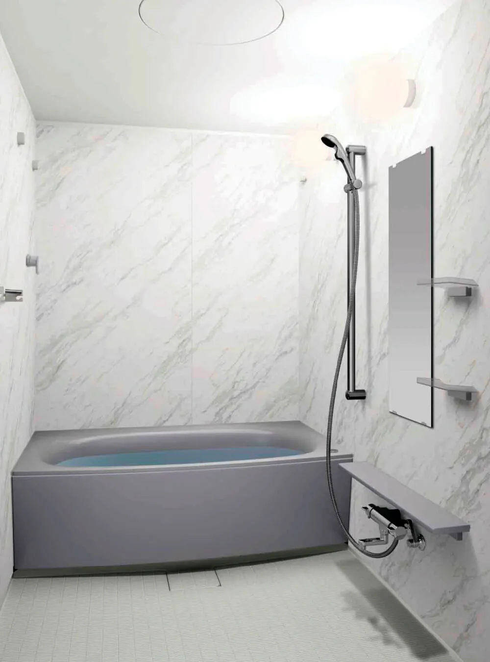 キャビネットを備えたシステムトイレを採用。空間をすっきり広々とさせます。暖房便座・洗浄などの機能はシャワートイレの壁付リモコンでラクに操作。脱臭はもちろん、立ち上がり後、自動で強力脱臭に切り替わるオートパワー脱臭を備えています。