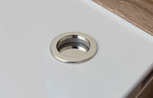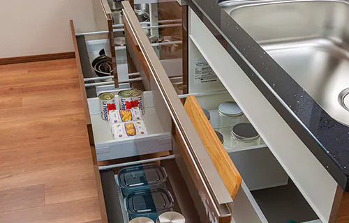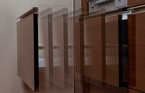 スライド式収納には、ゆっくりと静かに閉まるソフトクローズ設計を採用。食器やガラス製容器も安心して収納できます。