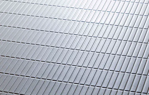 切り出した石をキチンと連続してそろえたようなデザイン。水の表面張力を壊す効果があり、乾きやすく、お掃除がしやすい床です。