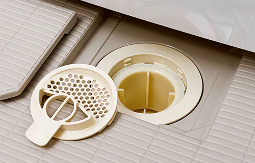 浴室の排水口には、髪の毛を絡みにくくしたフィルターを採用。排水口にたまった髪の毛もフィルターをひっくり返すことで簡単に捨てられます。
