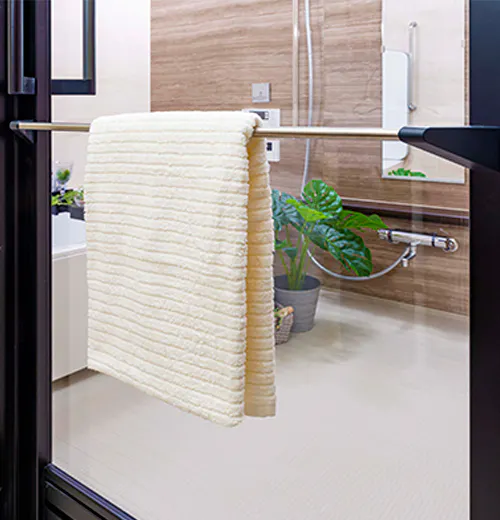 浴室ドアの外側にはタオル掛けを設置。バスタオルを掛けて使うことができます。