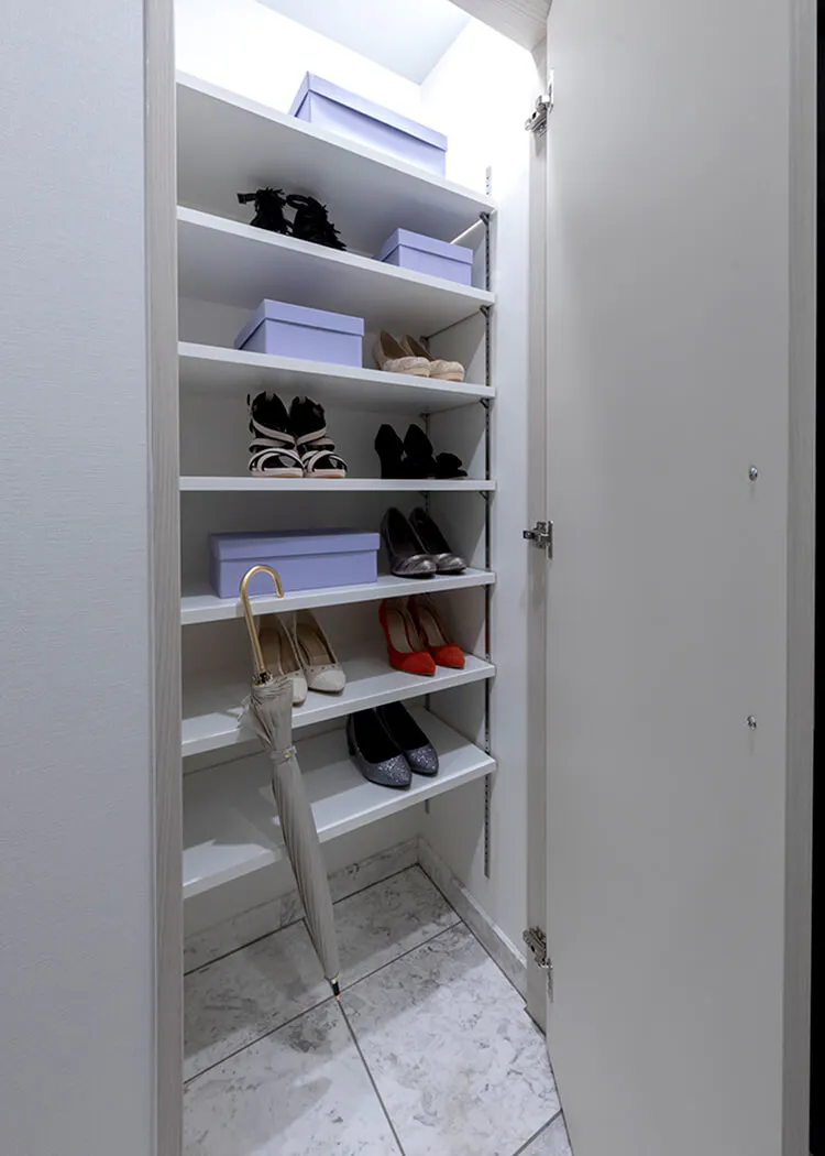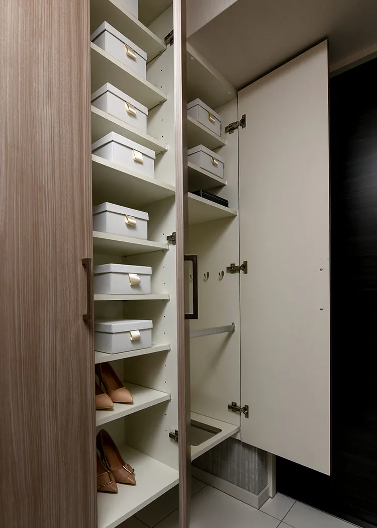 玄関を美しく整理できる収納量の豊かな玄関収納。スペースを調節できる機能的な可動棚を採用しています。