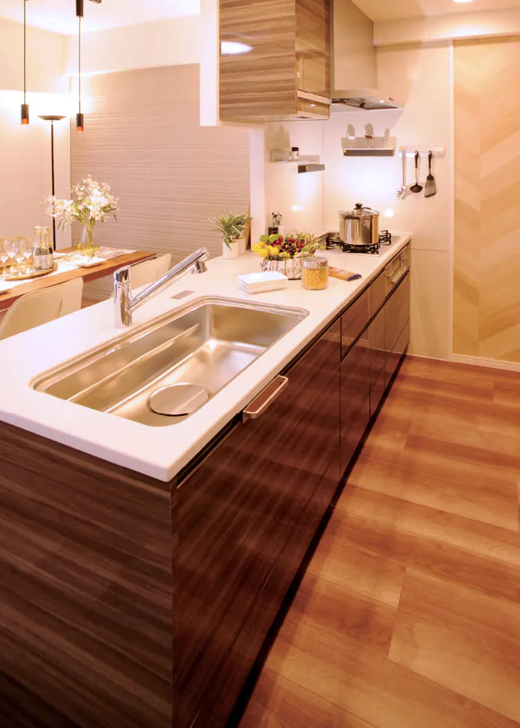 カウンターには、清潔でメンテナンスも容易な人造大理石を採用。キッチン空間を格調高く演出します。