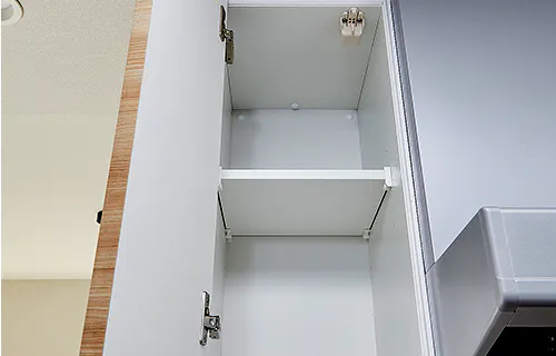 ペーパーストックや洗剤の収納に便利な吊戸棚も設置しています。