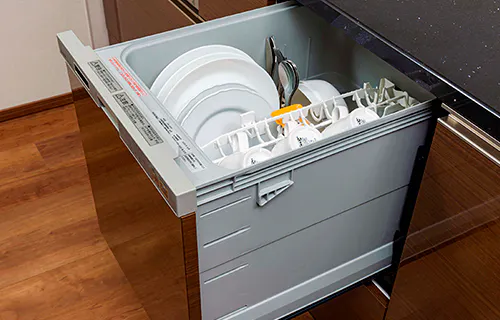 食器の出し入れがしやすいスライド収納タイプの食器洗い乾燥機。家事負担の軽減を図れます。