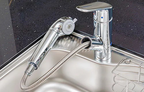 シンク内のお手入れに便利なハンドシャワータイプの水栓。いつでもおいしい水を利用できる浄水器も内蔵しています。