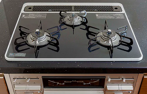 艶があって見た目にも美しいグリル付3口ガスコンロ。ハイパーガラスコートなので、汚れが落ちやすくお手入れも簡単です。