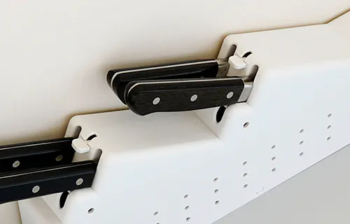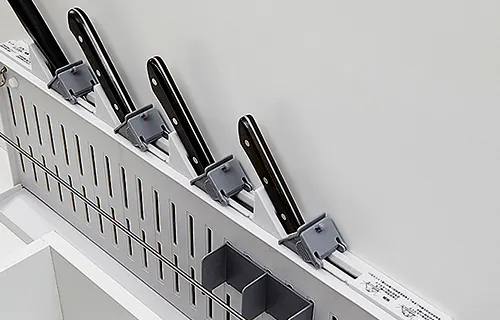レバーを上下させることでロックと解除ができる包丁差し。刃渡り210mmまでの包丁が最大4本収納可能です。