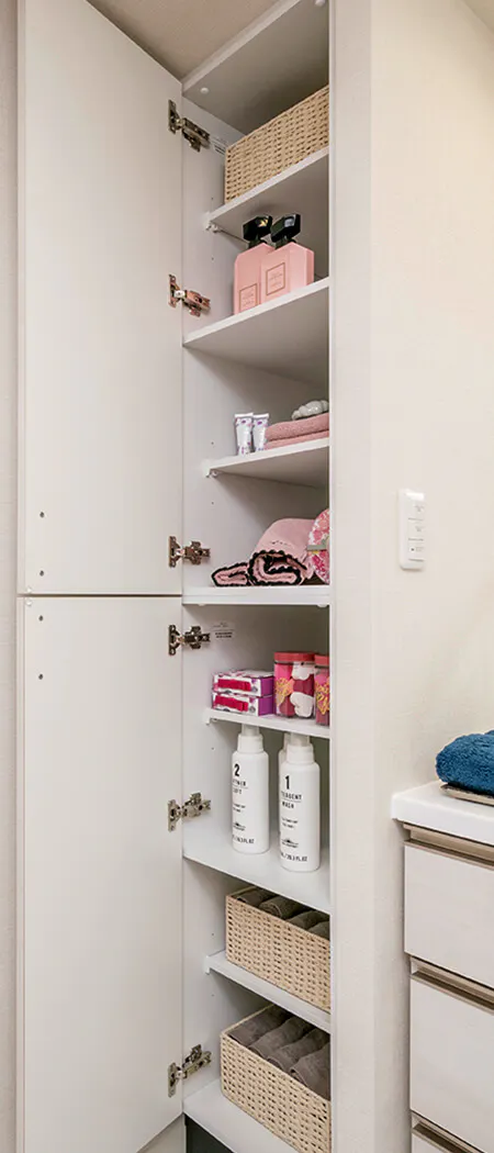 タオル類などの収納に便利なリネン庫をパウダールームに設けました。