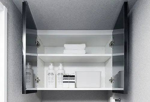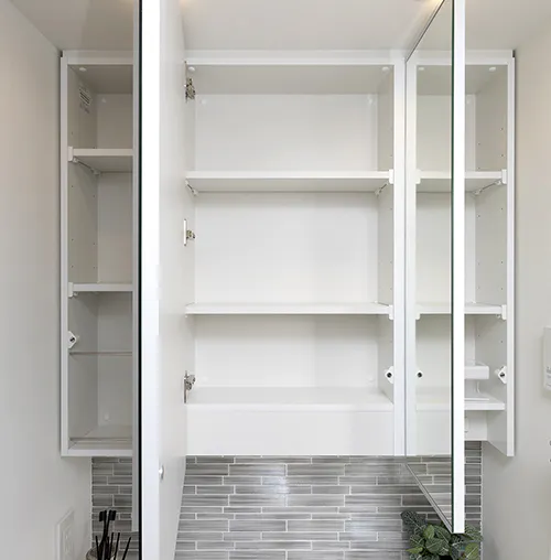 使い勝手のいい三面鏡。小物などを収納するスペースを鏡裏に確保しました。