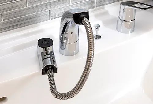 吐水口部を引き出してボウルのお掃除ができる便利な伸縮ノズルを採用。スタイリッシュなデザインも印象的。