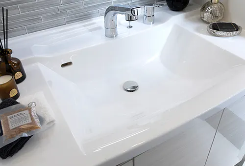 スタイリッシュで、お手入れもしやすい人造大理石仕様のボウル一体型洗面カウンター。
