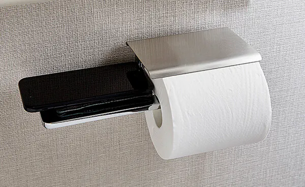 ペーパーホルダーには、スマートフォンなどを一時的に置ける小物置を設けました。