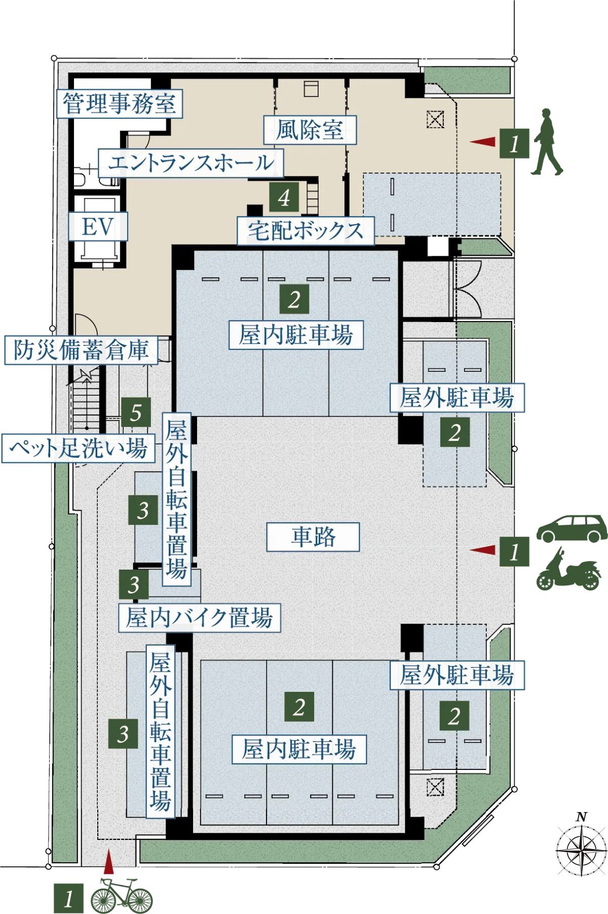 - 人と車、バイク、自転車の通るルートを分けて敷地内の安全性に配慮した歩車分離設計です。