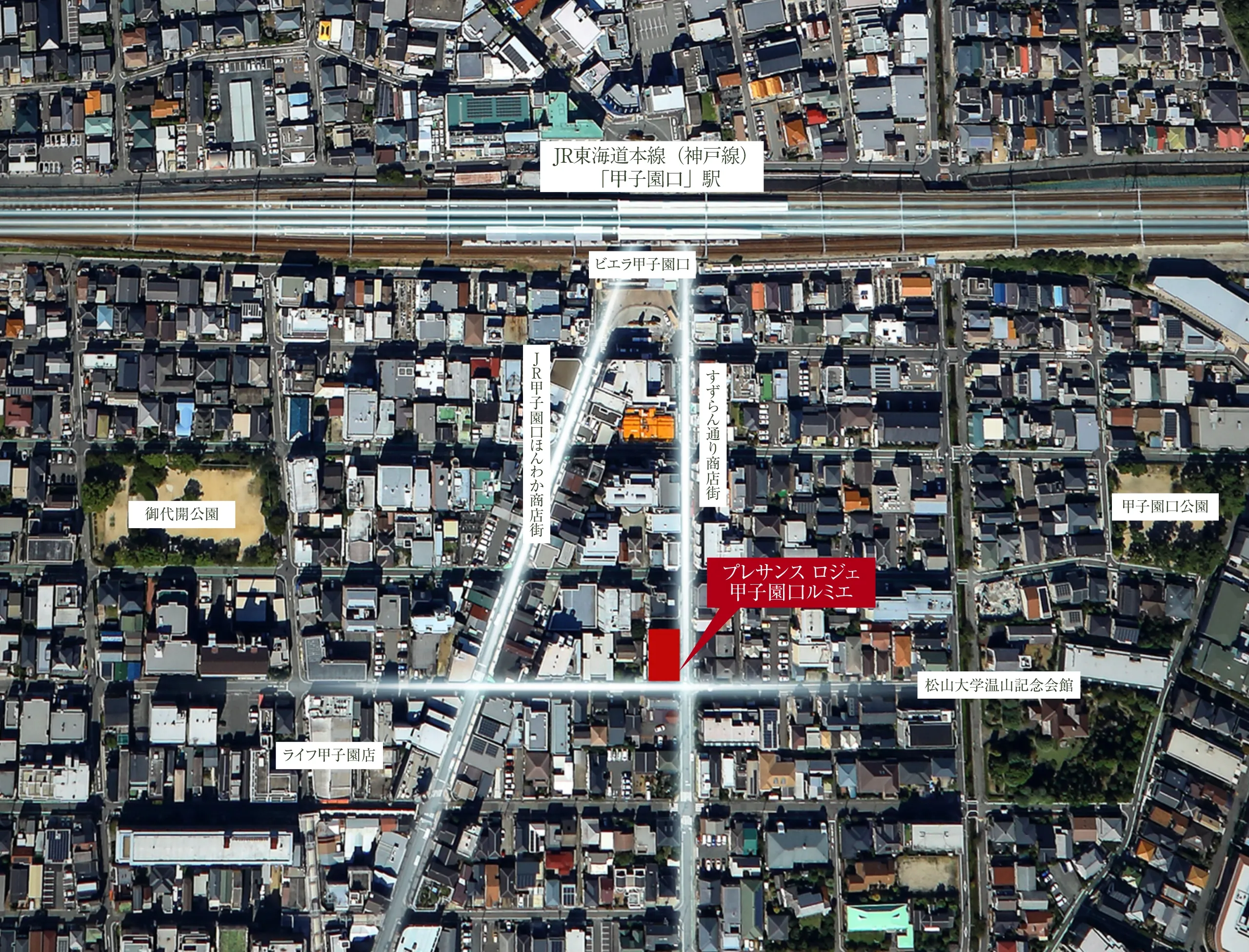 JR東海道本線(神戸線)「甲子園口」駅から続く 2つの商店街の間にあり、お洒落なカフェ、公園、 スーパーなどもあり、甲子園口駅前街区の特等席 であると実感出来ます。