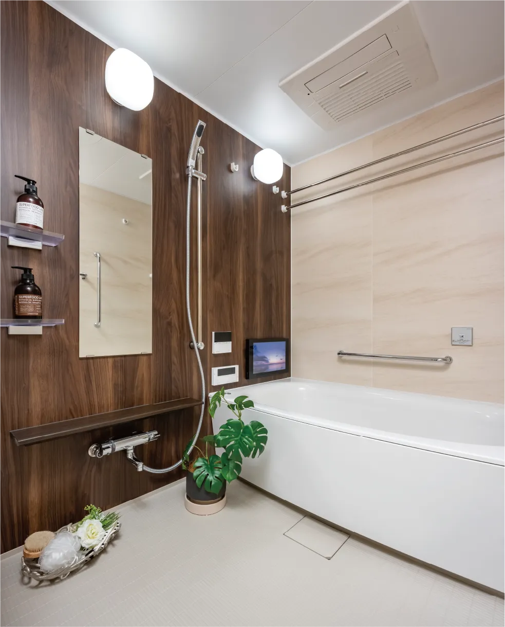 - 入浴中や立ち座りの際に体を支えられるよう、手摺を設置。ご年配の方やお子様の安全な入浴への配慮です。