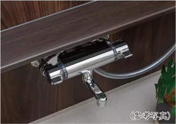 水栓&浴室カウンター - 設定された湯温を安定的にキープして供給するサーモスタット付混合水栓。湯温を簡単に調節できます。また、シャンプーなど小物も置ける浴室カウンターも設置しています。
