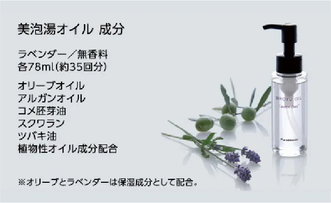※オイルヴェール酸素美泡湯には、美泡湯オイル(ラベンダー/無香料)各1本が付属します。※美泡湯オイルは追加でもご購入いただけます。詳しくは係員まで。