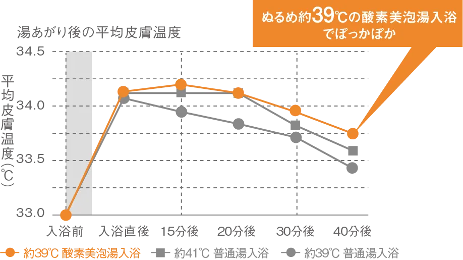 [実験方法]被験者:12名(成人男性6名・成人女性6名)/方法:普通湯入浴または酸素美泡湯入浴を別の日のほぼ同じ時刻に体験してもらい、入浴前後の身体の表面温度をサーモグラフィーにて撮影。(湯温約39℃または約41℃、入浴時間10分。平均皮膚温度はHardy-DuBoisの7点法を用いた。)