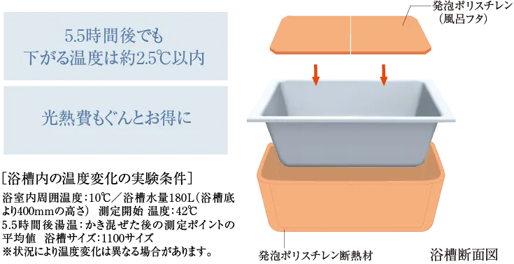 - 浴槽を発泡ポリスチレン断熱材でぐるっと断熱。追い焚き回数が減って光熱費も節約できます。
