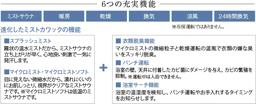 - やわらかな霧状のスプラッシュミストとナノ微細水で、視界がクリアなマイクロミスト。その日の気分で選べるミストサウナで、心身ともにリラックスできます。また、衣類乾燥や浴室暖房といったカワック本来の機能に加え、衣類脱臭・カビの繁殖抑制などの先進機能も搭載しています。