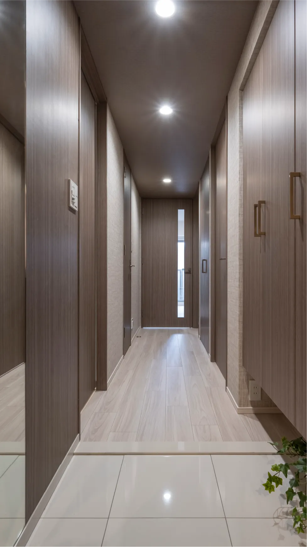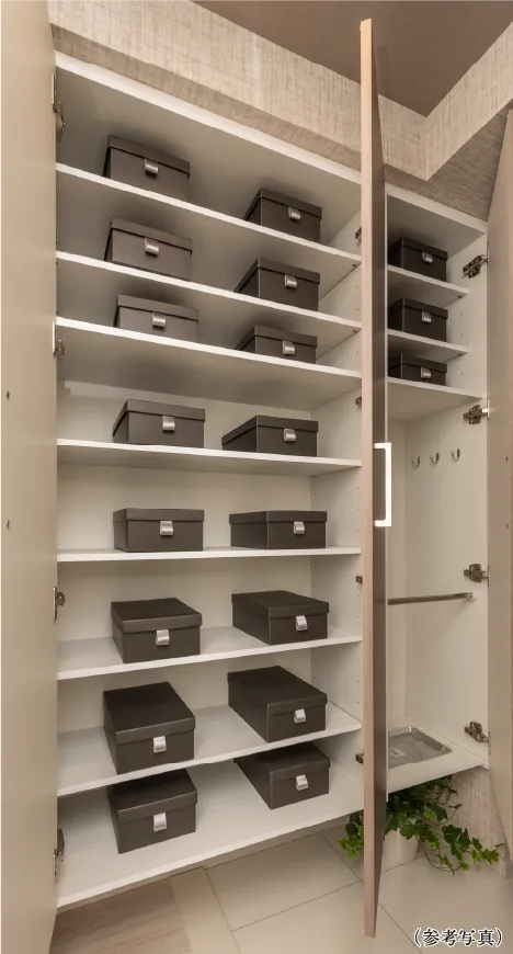 - ブーツもラクに収納できるほか、傘用の収納スペースも備えた収納量の豊かなトールタイプの玄関収納を採用。