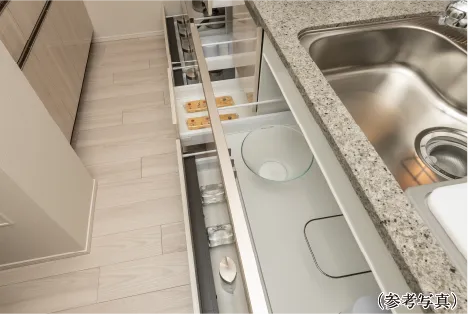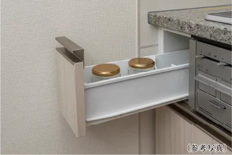 - 奥のスペースまで有効に活かせ、出し入れもしやすいスライド式収納。大きな鍋から調味料までを効率よく整理できます。