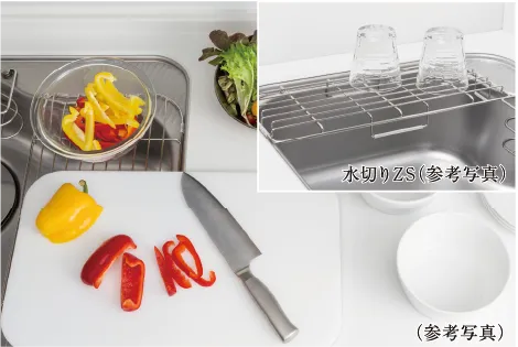 - 水切りの上にまな板を渡して調理スペースを拡大できる「水切りZS」付。シンクの裏側に制振材を備え、水はね音などを抑える静音タイプです。