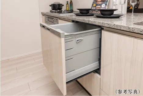 - 食器の出し入れがしやすいスライド収納タイプの食器洗い乾燥機。家事負担の軽減を図れます。