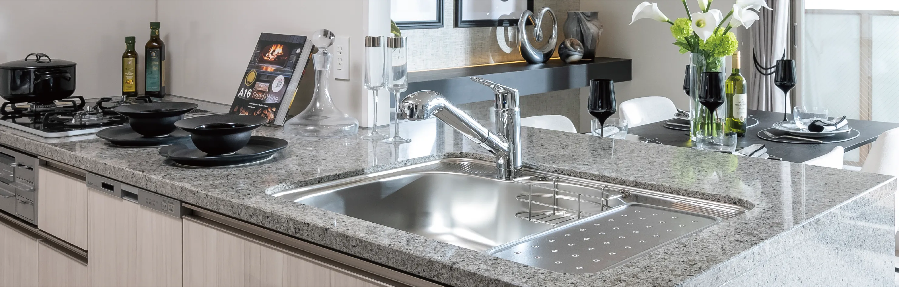 - 清潔で耐久性に優れた人造大理石製のカウンタートップ。美しい表情がキッチン空間のインテリア性を高めます。