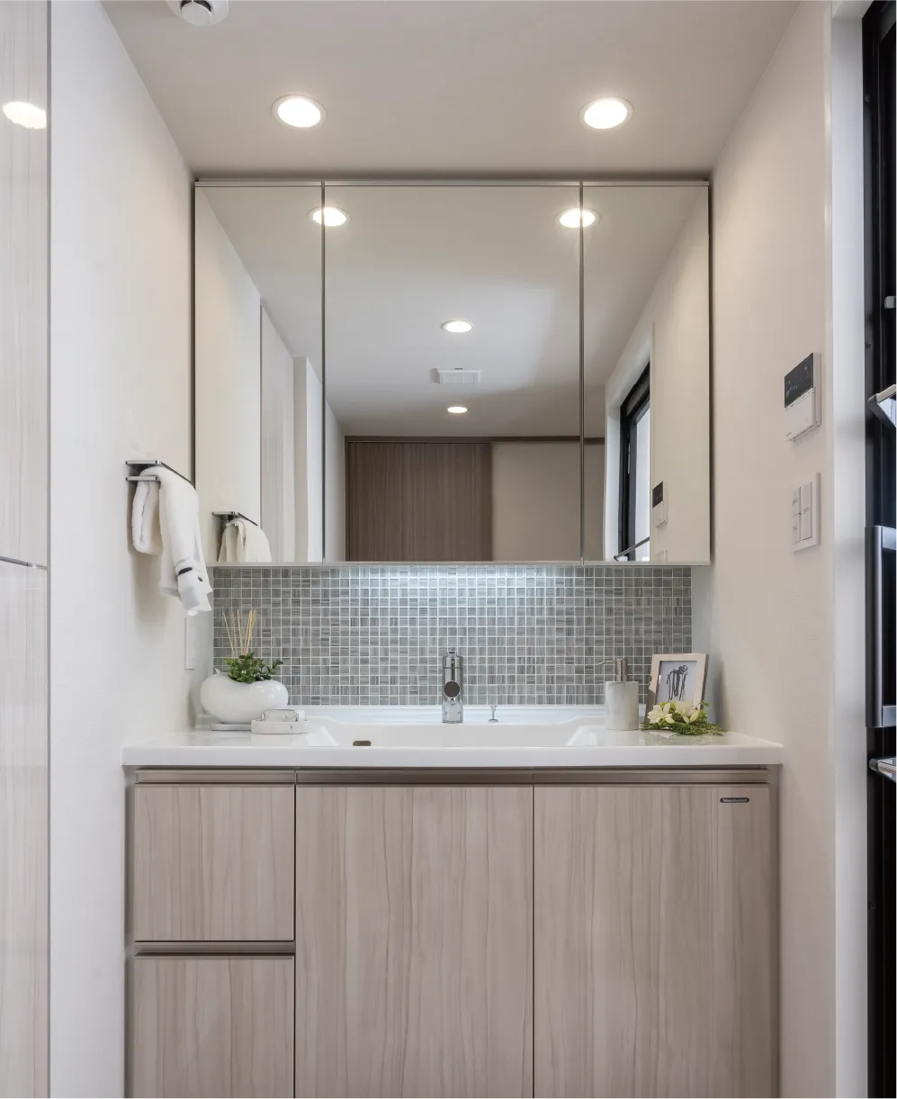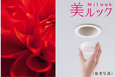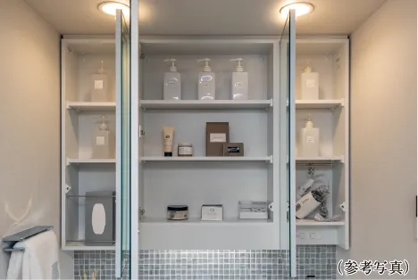 - 洗面化粧台上部のダウンライトには、本来の色を忠実に見せるあかり「美ルック」を採用。お肌の色味も素敵に見えるあかりで、一日の始まりを気持ちよくスタートしましょう。