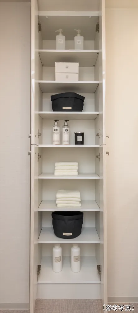 - タオル類などの収納に便利なリネン庫をパウダールームに設けました。