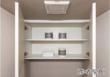 - 洗剤やトイレットペーパーなどの収納に便利な扉付きの吊戸棚も設置しました。