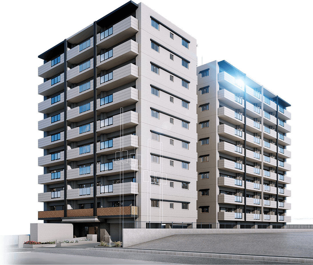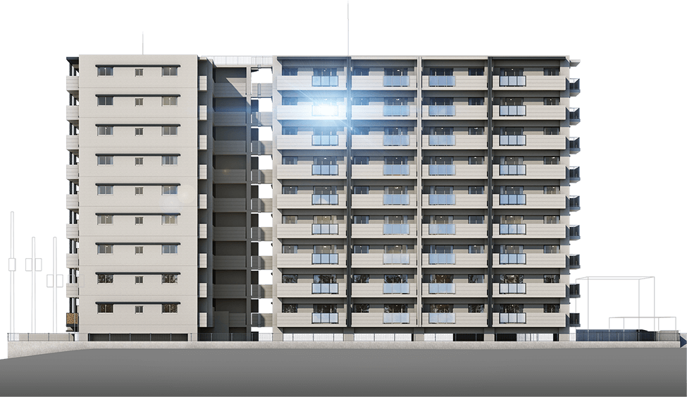 地上10階建ののびやかなフォルムが青空に映え、街並みに上質な存在感を刻む全63邸。南向き・東向きの住戸配置にこだわり、室内には豊かな陽光と爽やかな風を取り込む開放感※2を演出。さらに角住戸率約57%(63戸中36戸)というプランニングにより、プライバシー性と独立性を確保しました。