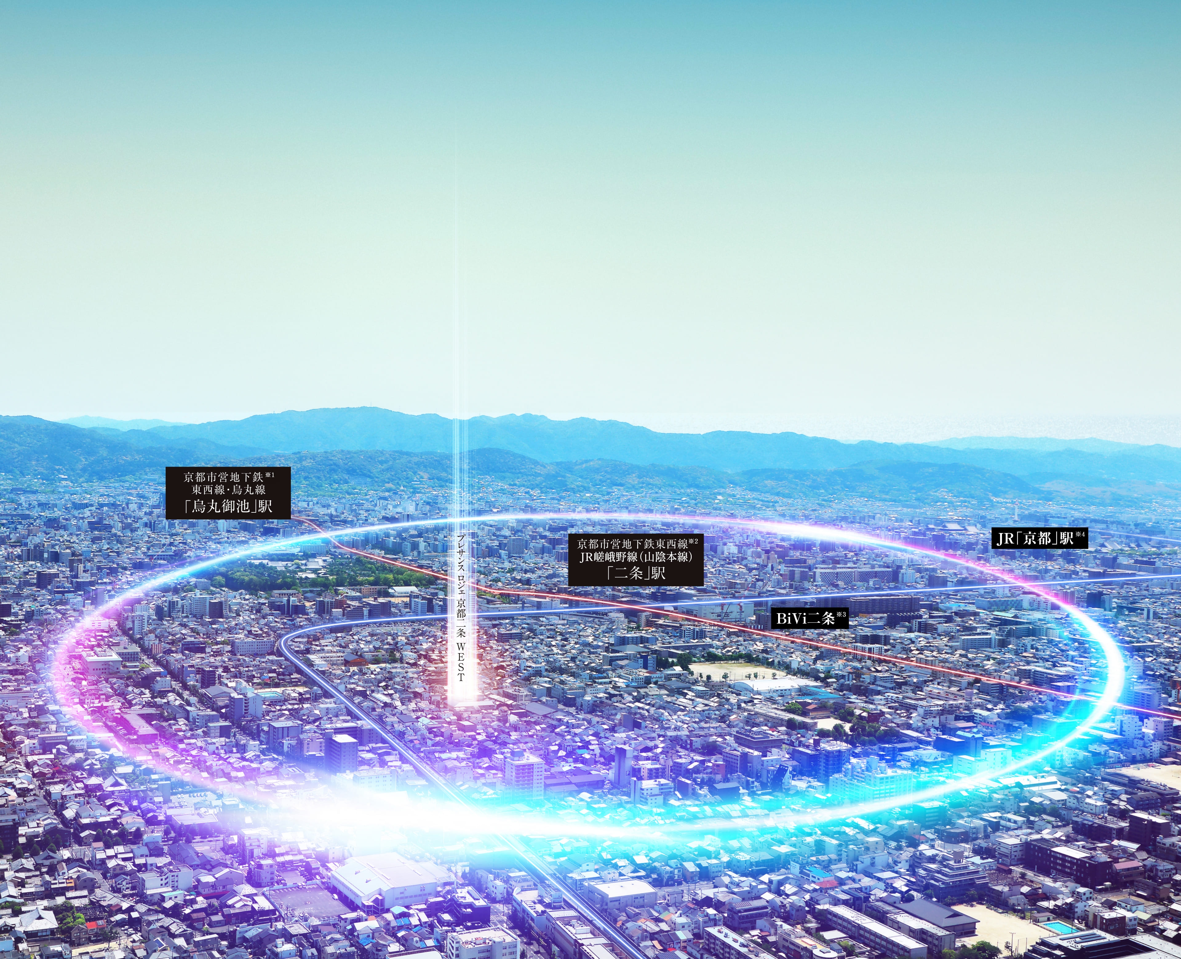 ※1:京都市営地下鉄東西線「烏丸御池」駅(京都市営地下鉄東西線「二条」駅より直通4分、日中平常時4分)、※2:京都市営地下鉄東西線「二条」駅(3番出入口、徒歩13分/現地より約990m)、JR嵯峨野線(山陰本線)「二条」駅(西口、徒歩14分/現地より約1,110m)、※3:BiVi二条(徒歩15分・現地より約1,130m)、※4:JR嵯峨野線(山陰本線)「京都」駅(JR嵯峨野線(山陰本線)「二条」駅より直通4分<快速利用>、日中平常時4分)、※掲載の航空写真は、現地周辺を撮影(2025年8月)したものにCG処理を施して描いたもので実際とは異なります。また現地の位置を表現した光柱は、建物の規模や高さを示すものではありません。