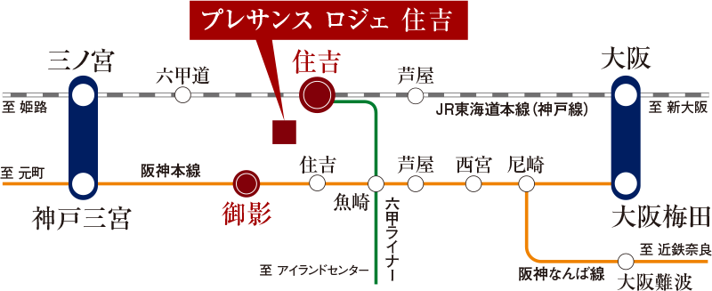 徒歩5分のJR東海道本線(神戸線)「住吉」駅(現地より390m)からは、