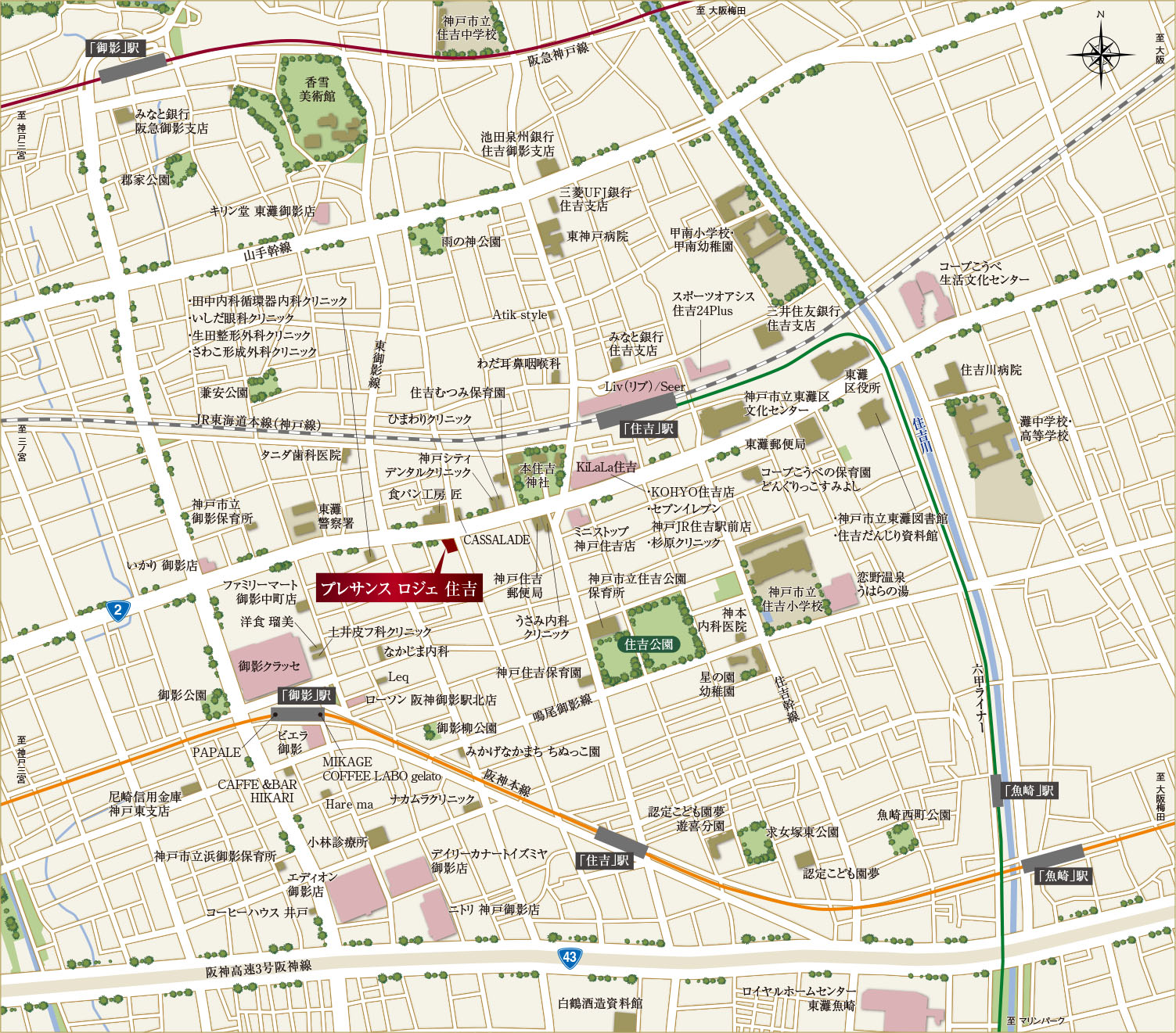 また、住吉公園をはじめとする大小の公園や清流に癒される住吉川(徒歩11分/現地より約820m)など、憩いの場も身近な場所にあります。