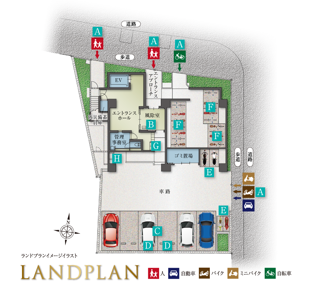 配慮を行き届かせたランドプラン。敷地は、東側と北側が公道に面する開放的な二方接道の角地。