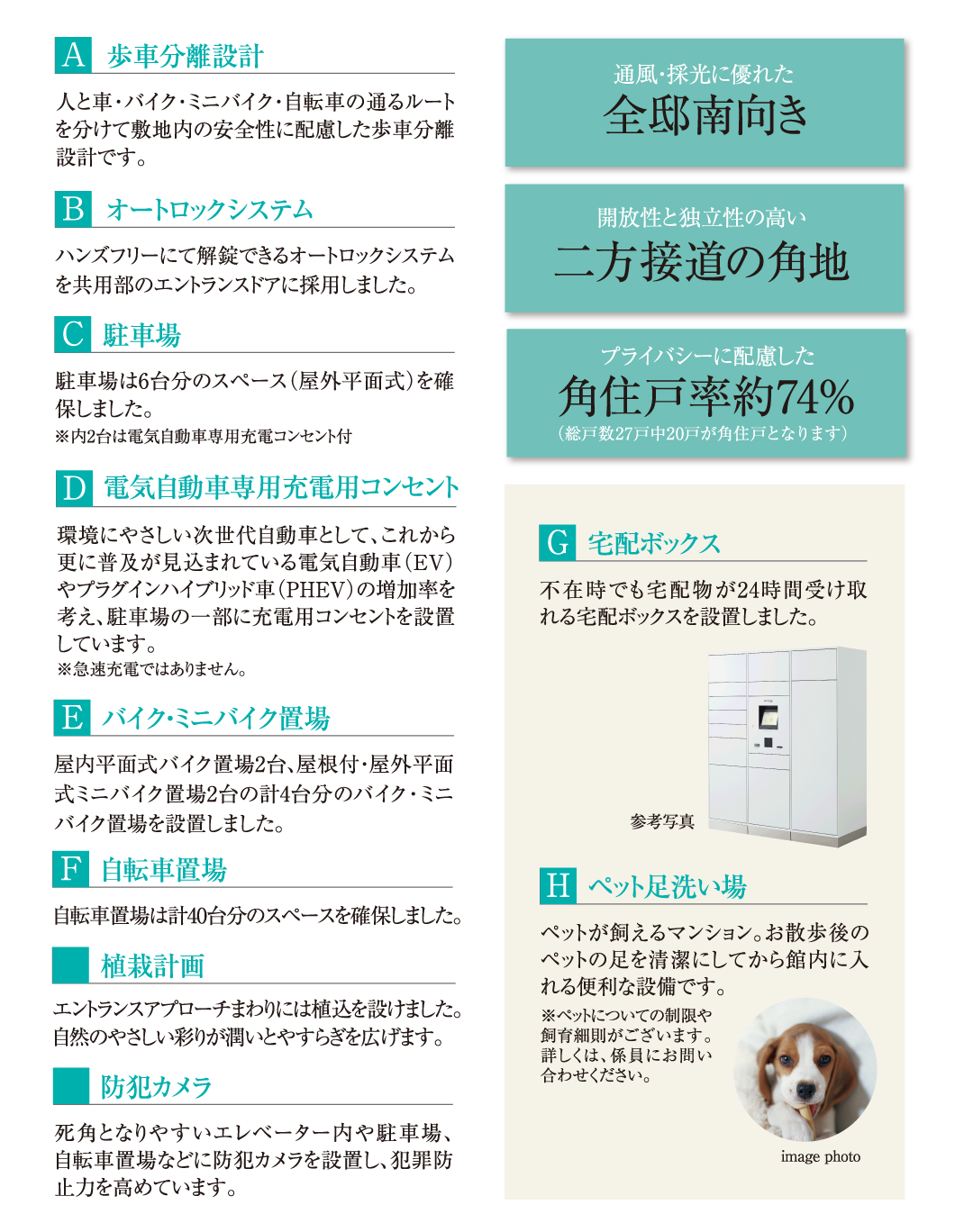 住棟の南側に駐車場を設け、住戸に開放感※1を創出するランドプランを計画。住戸配置は全邸南向きで、1フロア2〜3邸として角住戸率も約74%(総戸数27戸中20戸が角住戸となります)を実現。陽光の明るさにあふれ、プライバシーも守られやすい住まいをお届けします。