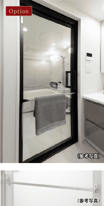 浴室ドアの外側にはタオル掛けを設置しました。バスタオルを掛けておけば、湯上がりにすぐ手に取れます。※写真の扉の透明ガラスは先行オプション対応