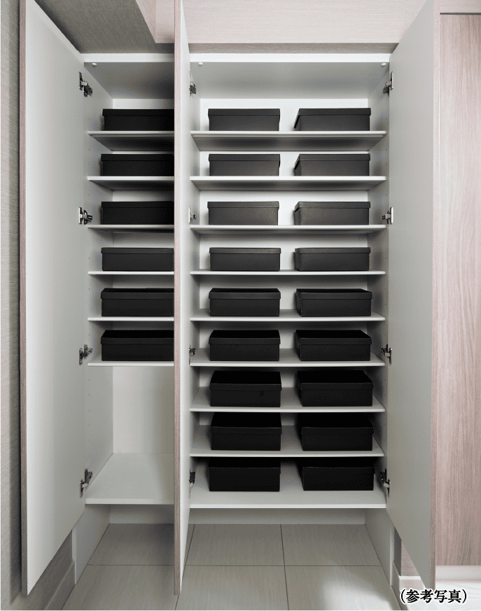 玄関を美しく整理できる収納量の豊かなシューズインクロゼット。スペースを調節できる機能的な可動棚を採用しています。