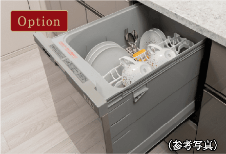 食器の出し入れがしやすいスライド収納タイプの食器洗い乾燥機。家事負担の軽減を図れます。※有償オプションとなります。