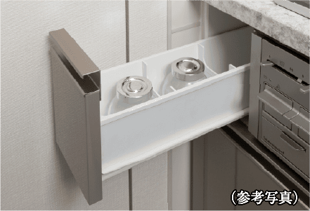 奥のスペースまで有効に活かせ、出し入れもしやすいスライド式収納。大きな鍋から調味料までを効率よく整理できます。※巾木収納ではありません。
