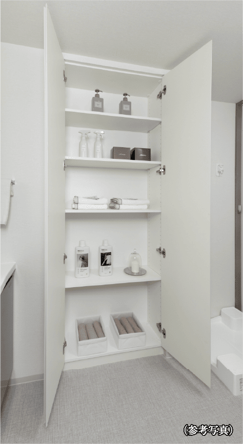 タオル類などの収納に便利なリネン庫をパウダールームに設けました。