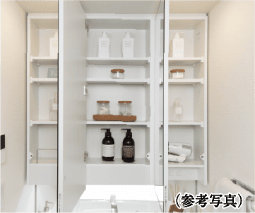 三面鏡裏には、化粧品や小物などがすっきりと収納できるスペースを確保しました。